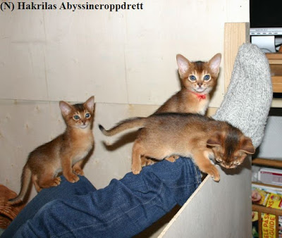 Her er det matmor sine tær som blir gjenstand for fire hjørnetenner 🙂 PS! Til orientering ser jeg ut som en selvskader på leggene… Det er ikke godt når 3 abyssinerkattunger bruker buksebeinet som klatrestativ 🙂
