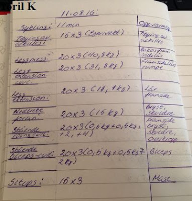 Siden jeg har betennelse i sceneplaten under hælen gjør jeg øvelser som ikke belaster den. Jeg har fått beskjed om å avlaste med krykker når jeg er ute. Jeg vet at jeg må igjennom en ny operasjon under sceneplaten i løpet av høsten, og det å få trent godt på forhånd med styrketrening er til stor hjelp 🙂