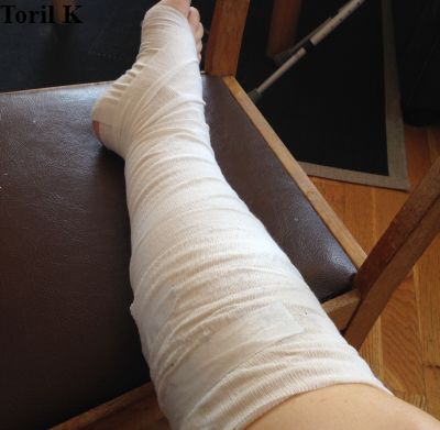 Jeg reiste hjem fra sykehuset 11.05.2016, og den første uka fikk jeg beskjed om å sitte med ispose, og ha foten høyt på en pute. Etter en uke (tirsdag 17.05.2016) fikk jeg lov til å ta på meg en softcast-skinne som jeg skal ha på i 7 uker til, og det hjelper utrolig på. Nå kan jeg gå innendørs uten krykker, og jeg kan gjøre mer. Det var en kjempegod følelse å få lov til å dusje i går morgest!