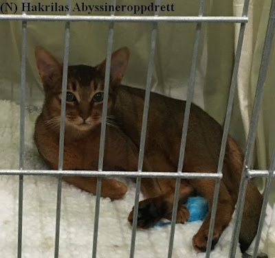 Emelie sin kjempefine blå abyssinerhunnkatt på dommerbordet til sin grunnbedømmelse 🙂