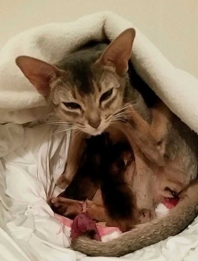 Natt til i dag fødte Nubi (Eier: Liss Overgaard Oppdretter: Emelie Christina) to viltfargede kattunger. Dette er det første kullet i Liss sitt abyssineroppdrett (NO* Ojas). Gratulerer med to kjempeflotte, fine og velskapte kattunger <3 🙂 Foto: Liss Overgaard