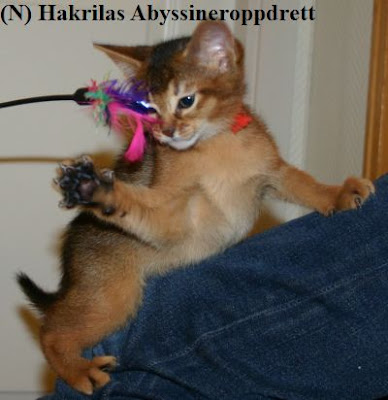 Kattungene har hver sine leker som de liker å leke med. Grace elsker å leke med fjærleken. Fjærleken på sin side har bare 3-4 fjær igjen. På vår utstilling neste helg tror jeg at jeg skal gå til anskaffelse på 3-4 fjærleker slik at jeg har i reserve 🙂 Når Grace leker med fjærleken, er den hennes. Hvis Gaya eller Gizmo kommer for å leke med fjærleken knurrer hun mot dem. Byttet er hennes, og hun prøver også å stikke av med “byttet” 🙂