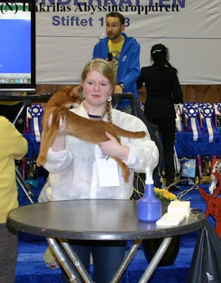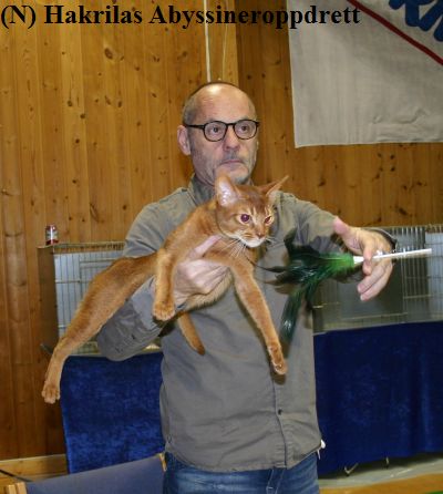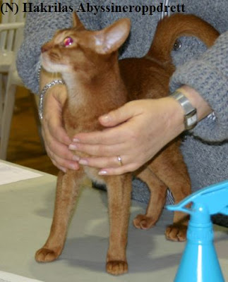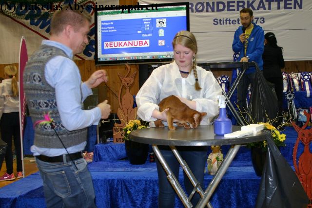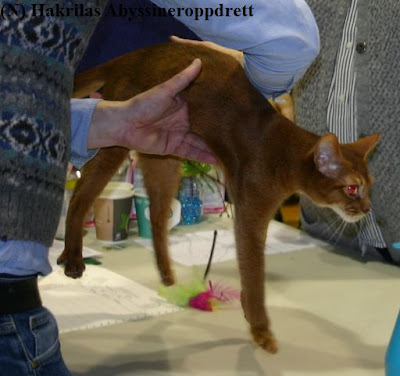 Den kjempefine abyssinerhunnkatten (Shakira) til min abyssinervenninne på dommerbordet til sin grunnbedømmelse 🙂 Shakira tok sitt 11. CACS-cert, og tok dermed den høyeste tittelen som det går an å komme som fertil, nemlig Supreme Champion 🙂