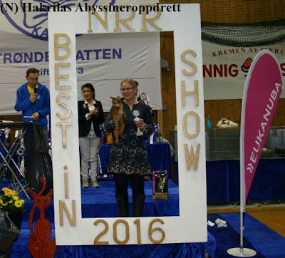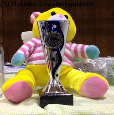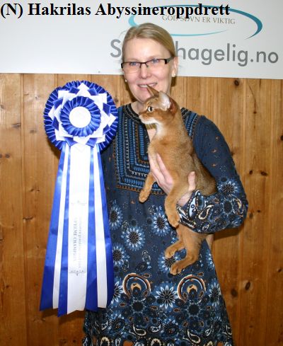 Stolt matmor Solfrid viser frem hennes kjempefine abyssinerhunnkatt (Ingave’s Shakira) som ble Supreme Champion 20.03.2016 🙂 Se på den kjempefine tittelsløyfen hun fikk da 🙂